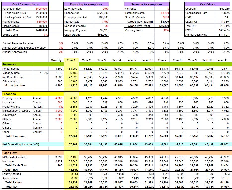 We now have all the data to assess the value of this property, but keep in mind, our assessment is only for the first year of ownership. In subsequent years, accrued annual equity will increase, expenses may rise (with inflation), rental rates may increase or decrease, depending on the market, your tax situation may change, and a host of other factors may contribute to the return on your investment either increasing or decreasing.